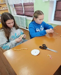 Мастер- класс "Японский шнурок на картонном круге в технике "кумихимо" для детей, посещающих оздоровительный лагерь при школе, провела руководитель школьного музея Л. М. Реутова.