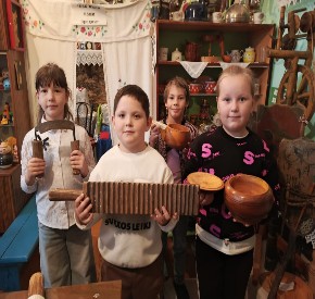 Главное место в русской избе занимала печь, где готовили еду, спали на ней, печь обогревала жилище. Ребята с интересом осмотрели выставку припечных жителей: ухваты, кочерга, сковородник, подовая лопата. Отгадали загадки, подержали эти предметы в руках. На полочках хранится посуда: деревянные и глиняные чашки, горшки, крынки, кувшины. Для чаепития кипятили чай в самоваре. Дети с интересом рассмотрели самовар и его устройство. Обязательным занятием женщины было прядение. В школьном музее собрана коллекция расписных прялок и самопрялок. Самую маленькую прялку для девочки ребята увидели впервые. Очень понравилась малышам экскурсия, которую провела Л. М. Реутова, а медведица Машка и медвежок Мишка пригласили их на следующее путешествие в старину.