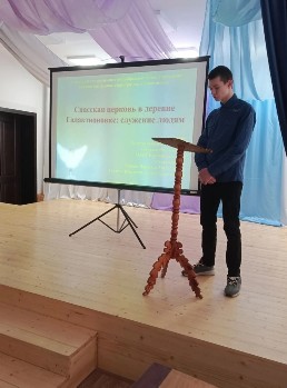 Булатова Анна представила свой творческий проект по теме «Ушёл на фронт и молодой учитель» и рассказала о первых годах педагогической деятельности в Коркинской семилетней школе Корсакова П.А., которого проводили на фронт в 1941 году.